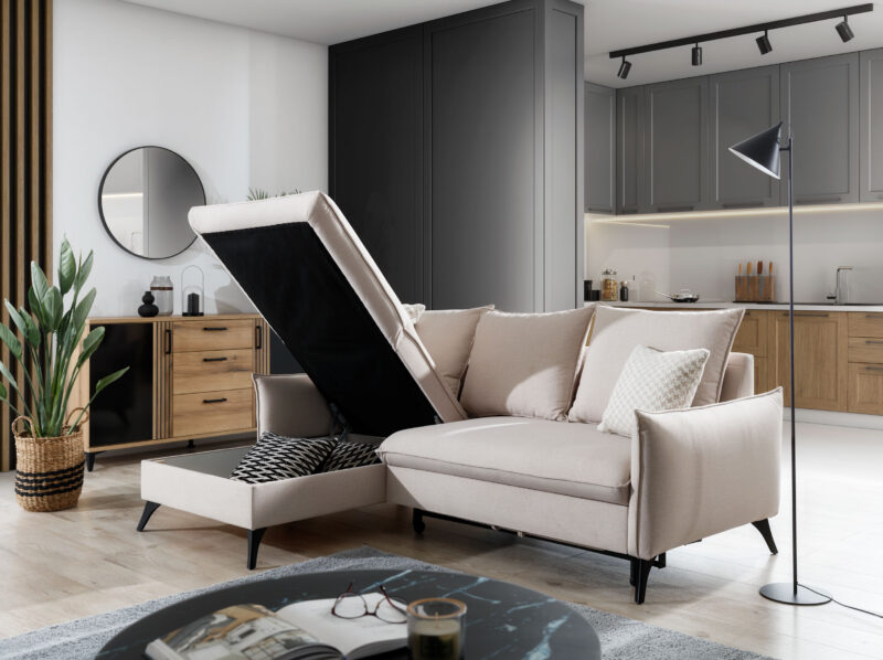 230 cm x 160 cm-es ágynak nyitható, ágyneműtartós jobbos és balos állásban, illetve a szivárvány minden színében egyedi kárpittal rendelhető, letisztult vonalú sarokgarnitúra díszpárnákkal.