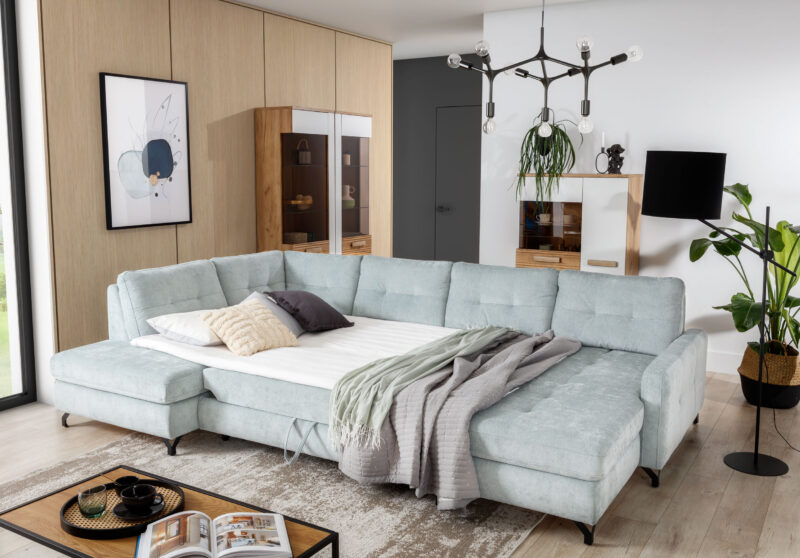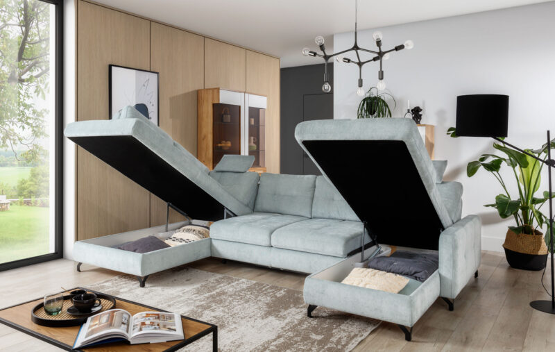 A NAWE U-alakú sarokgarnitúra alatt ágygépes rendszerű, hullámrugós felületű, kényelmes vendégágy funkció és 2db felnyíló ágyneműtartó található. A háttámlák mélysége állítható, így mindenki úgy alakíthatja magának a bútort ahogy neki kényelmes. Tűzött háttámlái és ülőfelülete modern megjelenést biztosítanak. A minőségi bútorvázat hullámrugók és hideg habszivacs borítja amely így tökéletes kényelmet nyújt használójának. Fekete vagy fém színben választható elegáns fémlábak teszik teljessé ezt a nagyszerű kanapét.